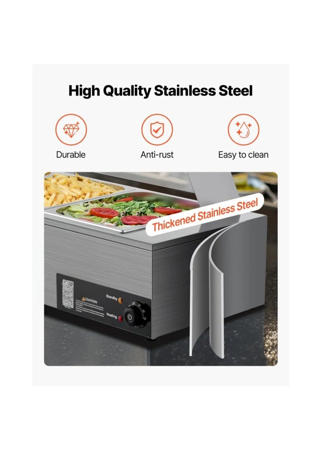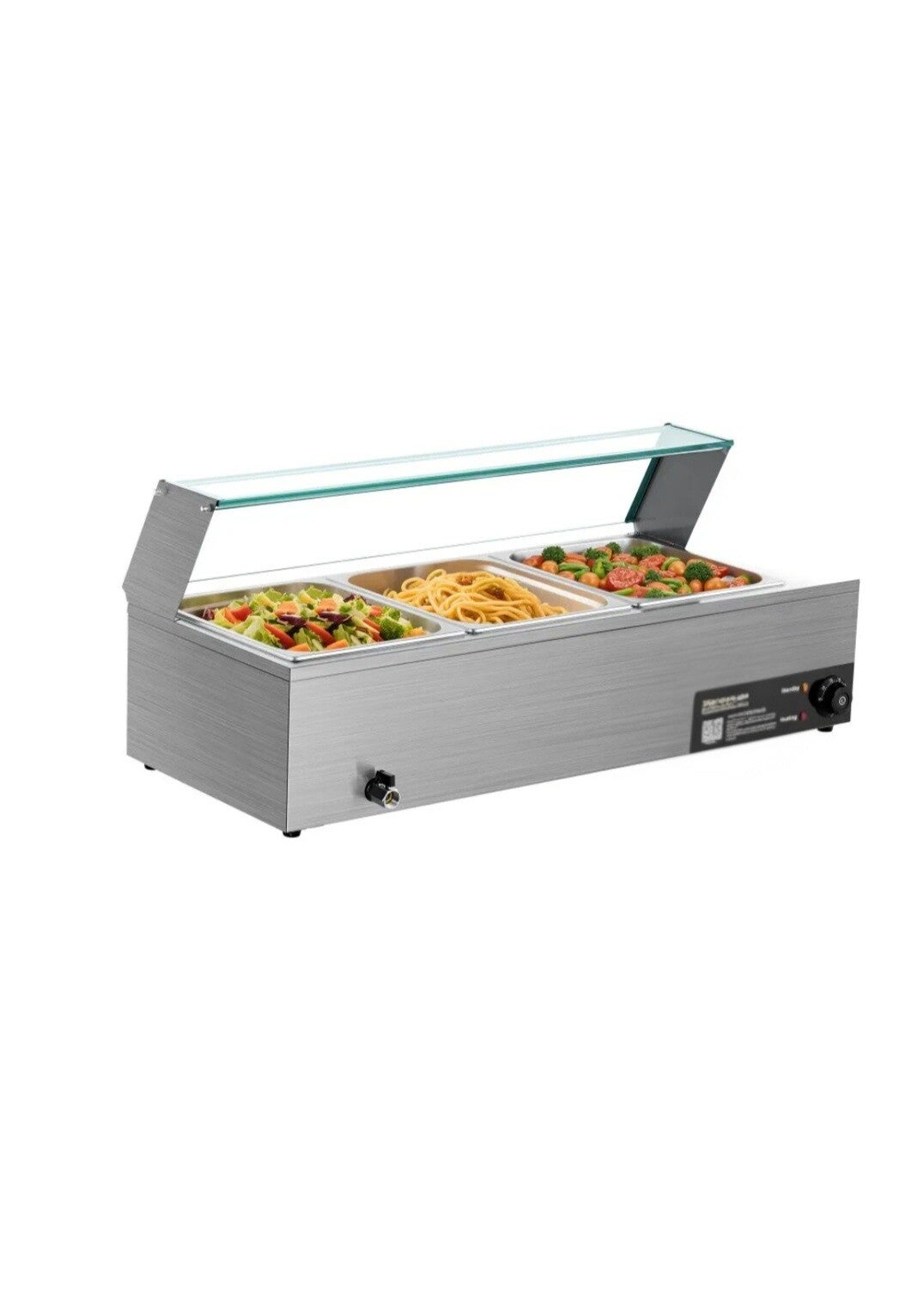 Snel en gelijkmatig verwarmen: Deze professionele voedselwarmer is uitgerust met een krachtig roestvrijstalen verwarmingselement van 1500 watt en verwarmt voedsel snel, waardoor de smaak behouden blijft. De temperatuur kan worden ingesteld van 30 tot 85 °C (86 tot 185 °F) om aan verschillende gerechten en serveervoorkeuren te voldoen.